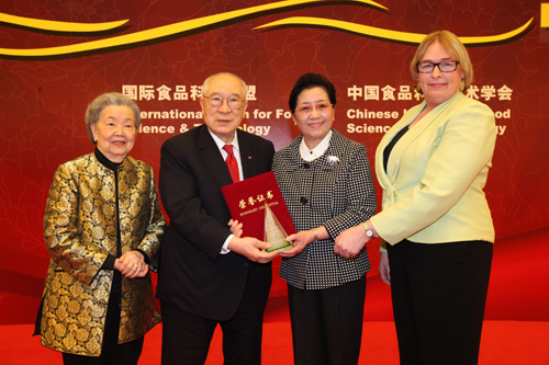 CIFST理事長藩蓓蕾和IUFoST秘書長朱迪為伍沾德博士頒發“中國食品工業特殊貢獻獎”